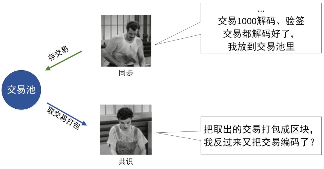 同步模块收到同步消息中的交易,是经过编码的,同步模块需将其解码成节点代码中的数据结构,再存入交易池中。共识模块打包区块时,把交易从交易池中取出,将交易进行编码,打包成区块,再将区块发送出去。在这个过程中,交易先被解码,又被编码,操作存在冗余。