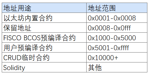 FSICO BCOS 2.0执行交易时,根据合约地址区分是不是预编译合约,所以开发完预编译合约后,需要在底层注册为预编译合约注册地址。2.0版本地址空间划分如下: