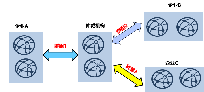 企业A、企业B和企业C分别和仲裁机构合作,采用区块链搭建仲裁服务。在群组架构下,搭链方式为:仲裁机构配置两个节点,分别加入三个群组;企业A配置两个节点,加入群组1;企业B配置两个节点,加入群组2;企业C配置两个节点,加入群组3。