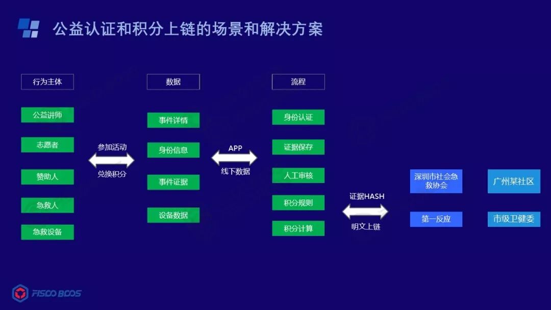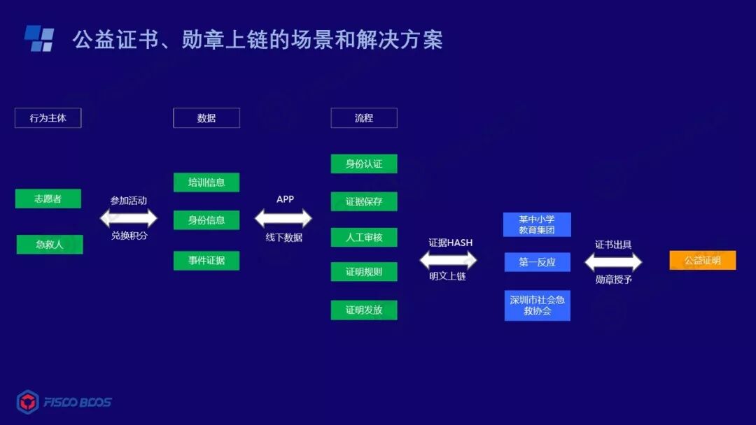 项目功能:将赛事保障、公益急救培训、社区互助急救、AED勘察等社会互助急救产品的证据、用户行为、积分奖励记录上链,实现公益行为的透明化、可追溯化和价值化,并且对接其他联盟企业,实现链上公益积分的流转。
