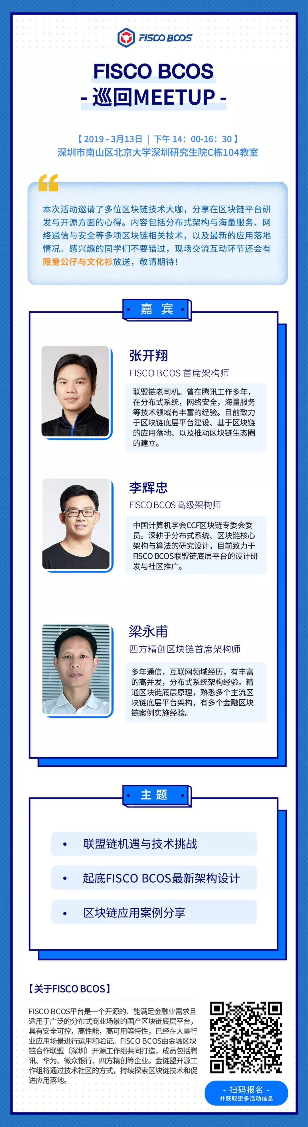 FISCO BCOS 巡回 meetup,为分布在全国各地的FISCO BCOS社区成员提供一个面对面交流的空间。每期活动,FISCO BCOS架构师都会在现场分享技术设计理念,共同找寻新的技术突破点。同时,我们还会邀请1~2位区块链应用先锋,和你分享TA在区块链领域的探索成果和避坑经验。