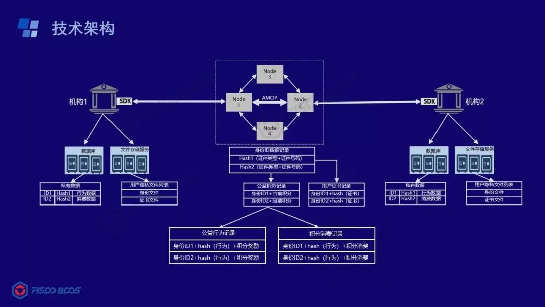 项目基于FISCO BCOS区块链底层平台研发,使得公益行为及其证据、积分、奖励过程以区块链的方式进行记录,确保公正、透明、不可篡改。