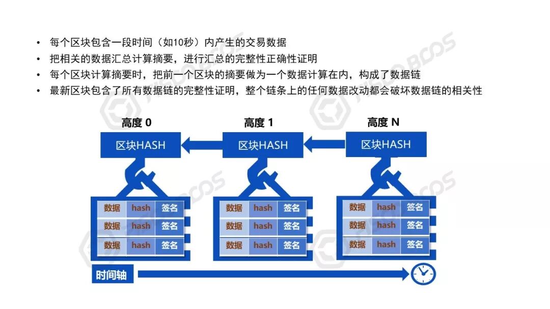 区块链的数据结构,无非是区块+链。新区块将自己的区块高度、交易列表,和上一个区块的HASH,共同再生成一个HASH做为新区块的标识,如此循环,形成了一个环环相扣的数据链。这个链条里的任何一个字节甚至一个Bit被修改,都会因为HASH算法的特性被校验发现。