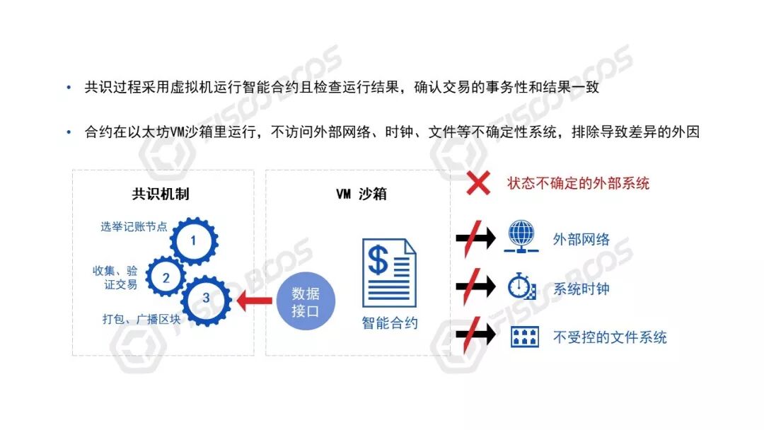 智能合约一般基于一个特制的虚拟机,使用沙盒模式运行,屏蔽掉可能导致不一致性的一些功能。比如获取系统时间这个操作,在不同的机器上,时钟都可能不同,这就可能导致依赖时间的业务逻辑出现问题。再比如随机数,以及外部文件系统、外部网站输入等,这些都可能导致虚拟机执行结果不同,都会被虚拟机沙盒环境隔离。