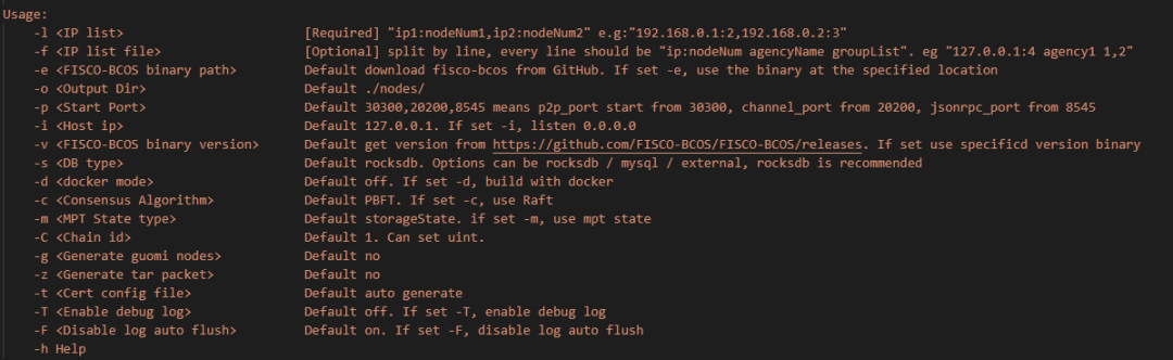 这个脚本能够完成环境检查、参数解析、FISCO BCOS二进制发布包下载、公私钥证书生成、配置文件生成和工具脚本生成等功能,支持MacOS、Linux 64bit、docker模式和国密版本搭建。