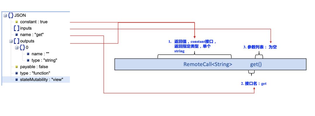 [{"constant":false,"inputs":[{"name":"n","type":"string"}],"name":"set","outputs":[],"payable":false,"type":"function","stateMutability":"nonpayable"},{"constant":true,"inputs":[],"name":"get","outputs":[{"name":"","type":"string"}],"payable":false,"type":"function","stateMutability":"view"},{"inputs":[],"type":"constructor","payable":true,"stateMutability":"payable"}]上述代码包含三个接口的描述信息:set、get、constructor(默认构造函数,无参数不处理)。关于set与get接口的生成可参考如下图示。