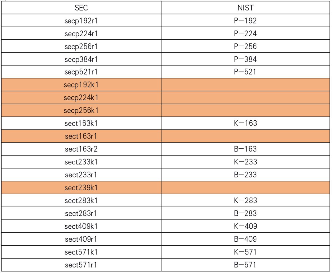 橙色底纹的几个SEC曲线没有对应的NIST曲线,因此SEC标准包含的曲线比NIST多一些,本文开头提到的secp256k1就是SEC单独存在的。