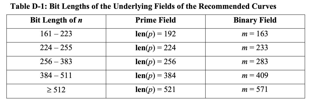 第三部分「256」就是有限域大小的表现形式,还有更多其他如192、224、384等,在「NIST FIPS 186-4」中有个表格展现了Fp 和F2m 两个域的各种不同大小配置。