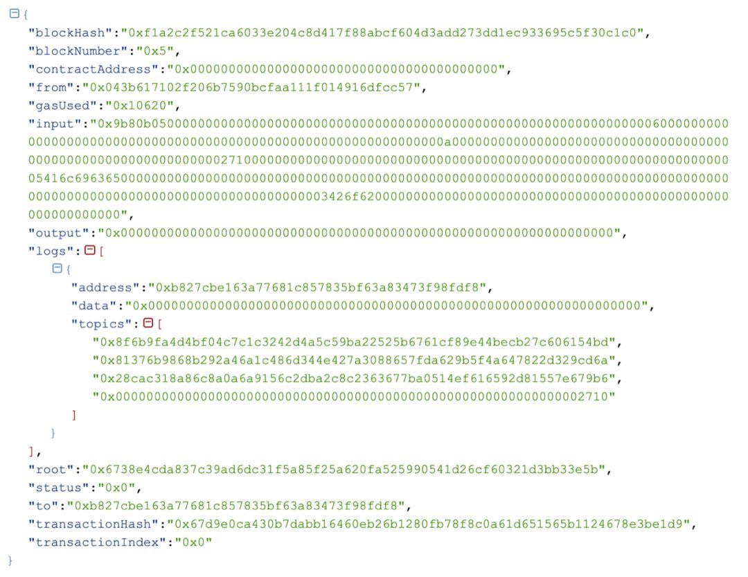 当调用合约接口时,可以向区块链发送一笔交易,并获取交易的回执,交易回执保存交易的输入参数、输出、Event log、执行状态等信息。