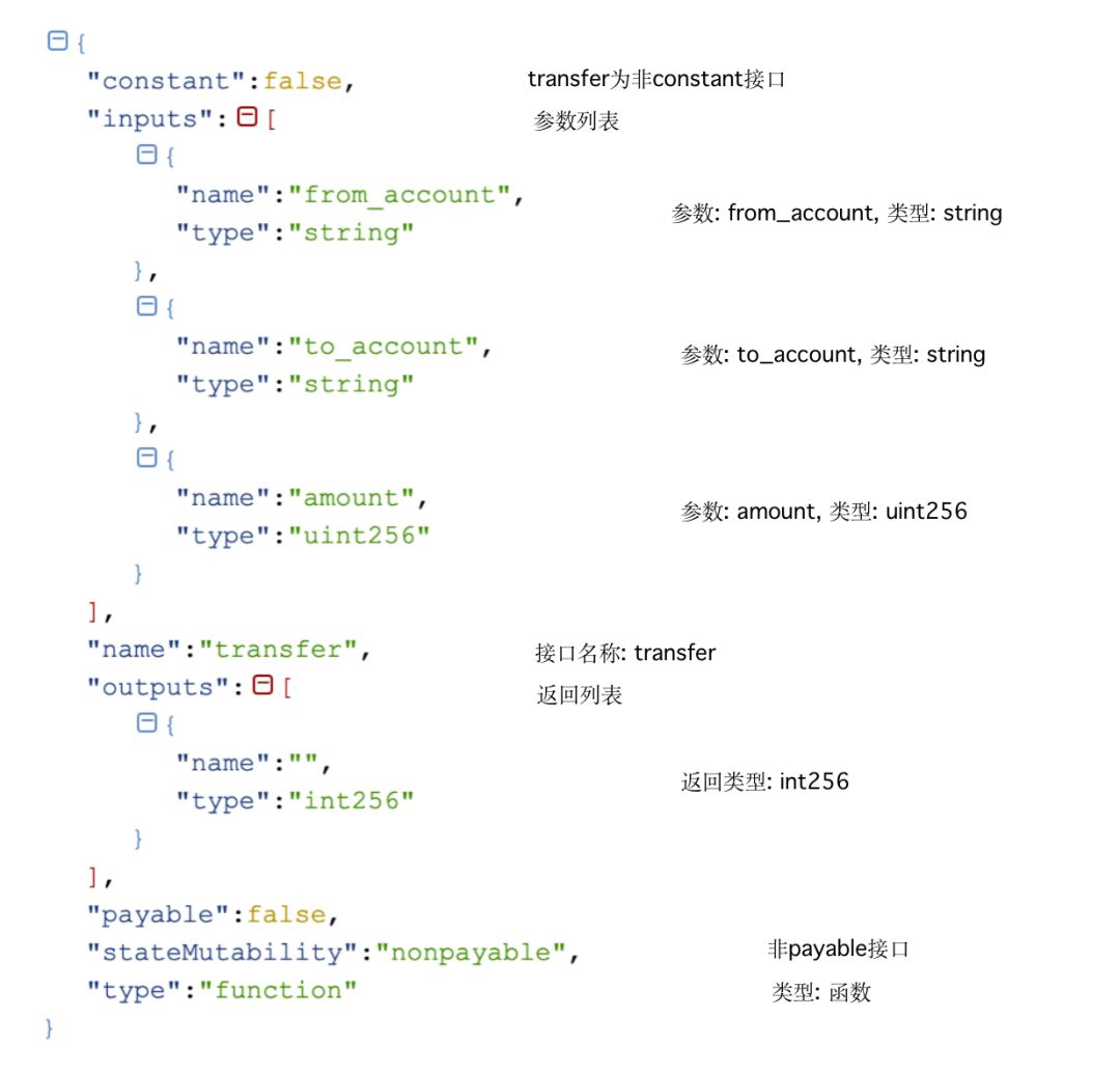 ABI是合约接口的说明,内容包括合约的接口列表、接口名称、参数名称、参数类型、返回类型等。