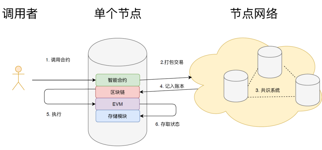 代码部署后,以字节码的形式存储在每一个节点上。当用户要求调用某个函数时,调用请求将会被囊括在交易中,并被打包到某个区块上,一旦全网对该区块形成共识,就意味着调用是合法的。