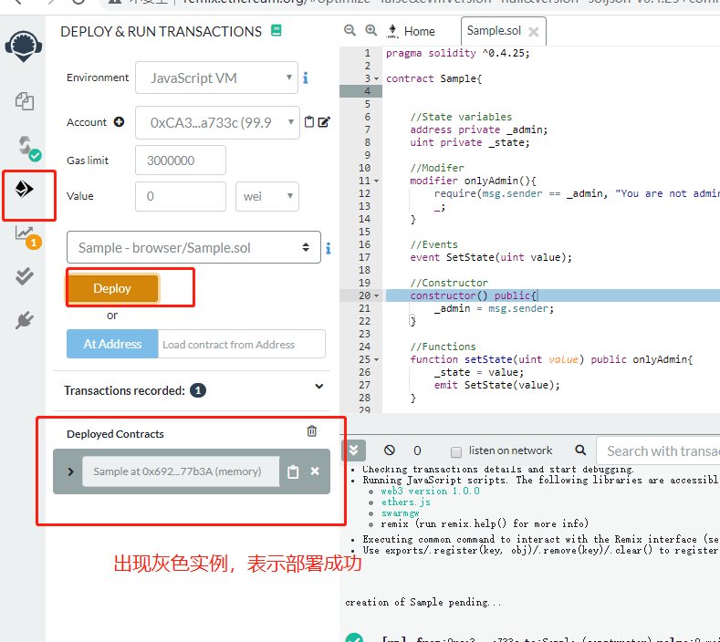 编译成功后就可进行部署环节,部署成功后会出现合约实例。