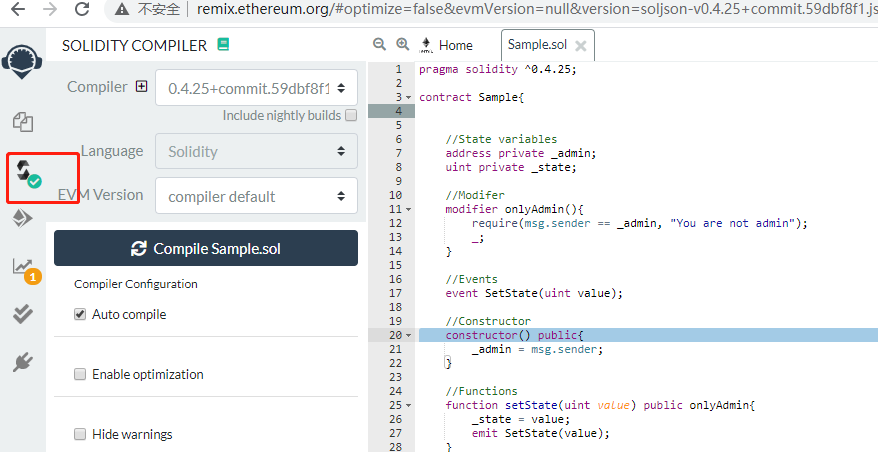 首先,在remix的文件ide中键入代码后,通过编译按钮来编译。成功后会在按钮上出现一个绿色对勾: