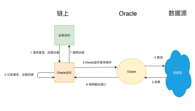 获取外部数据会通过名为Oracle的链外数据层来执行。当业务方的合约尝试获取外部数据时,会先将查询请求存入到某个Oracle专用合约内;Oracle会监听该合约,读取到这个查询请求后,执行查询,并调用业务合约响应接口使合约获取结果。
