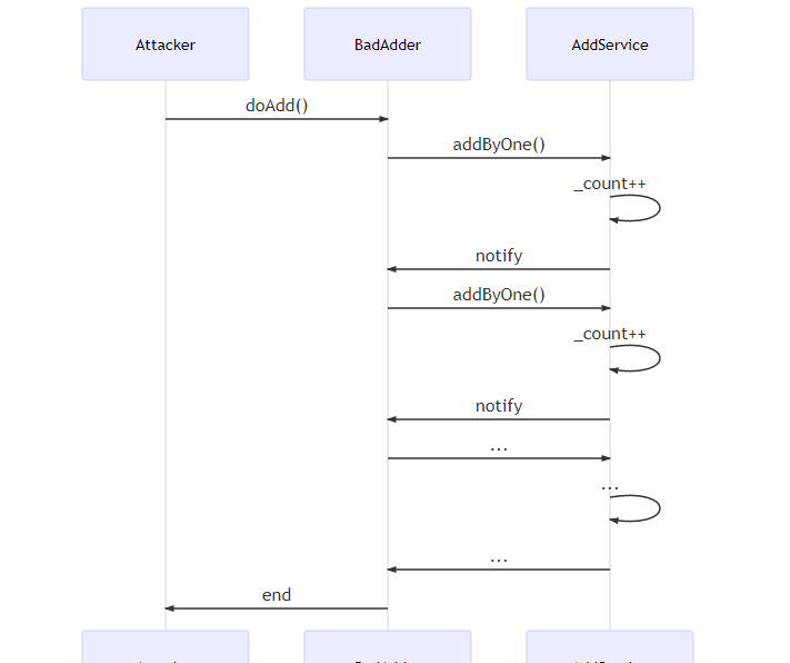 BadAdder在回调函数notify中,反过来继续调用AddService,由于AddService糟糕的代码设计,require条件检测语句被轻松绕过,攻击者可以直击_count字段,使其被任意地重复添加。