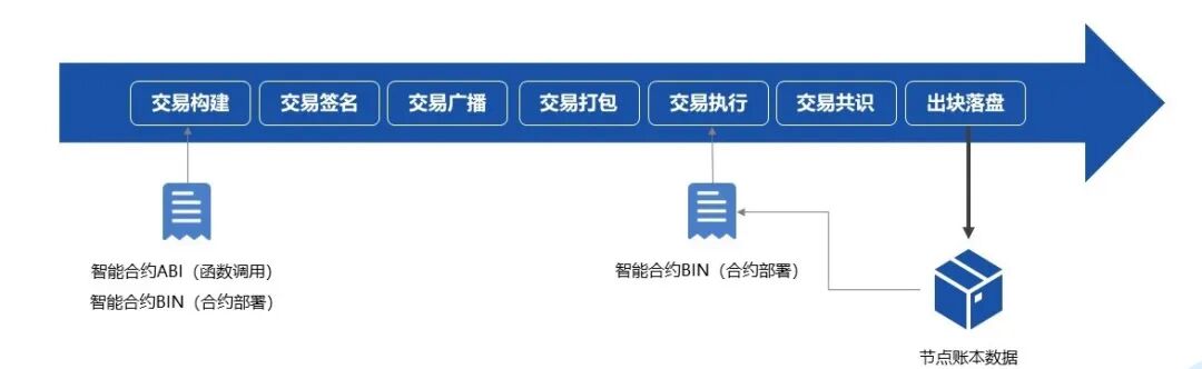 在交易执行前,需要完成合约部署,把智能合约的二进制编码存放到区块链网络上。交易执行阶段,也会回调获取整个智能合约的二进制编码,根据构建的交易解析相应二进制片段,二进制片段对应交易的执行指令集,交易会按照指令集执行。