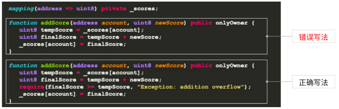 所以我们在加法或者类似的变量操作之后,需要进行合法性的校验。如果在这里加一个require条件判断,就可以及时检查,确保业务逻辑的正确性。