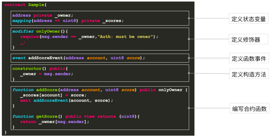 最后,我们会对定义的状态变量做一些操作或者业务上的处理,需要再去编写一些合约函数。以上就是Solidity合约的结构。