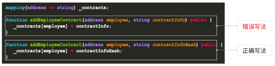 这份合约里的两个方法都很简单,就是添加一个雇员。在上面的写法中直接把合同相关信息写入,而下面的方法把合同哈希写入。为了确保用户隐私对合同进行加密处理。我们推荐第二种写法。