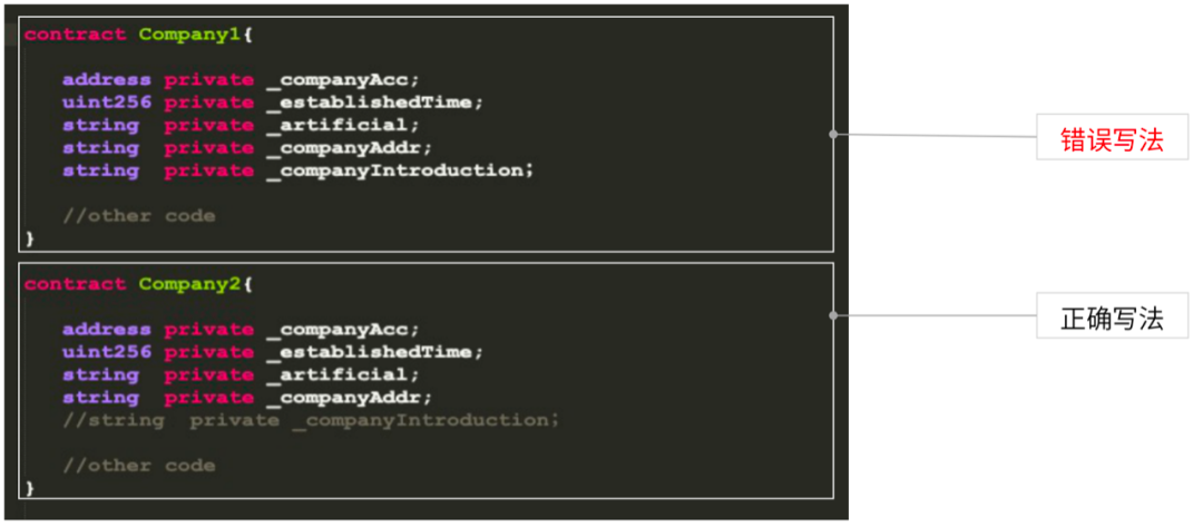 这里定义了两个公司的状态变量,在Company1中companyInduction变量存放公司的简介。这在Company2里被注释掉了。这是因为公司简介对链上交易逻辑没有多大影响,但从性能角度,其占据大量区块链网络节点内存、网络和存储开销,从而对整个网络性能造成极大压力。