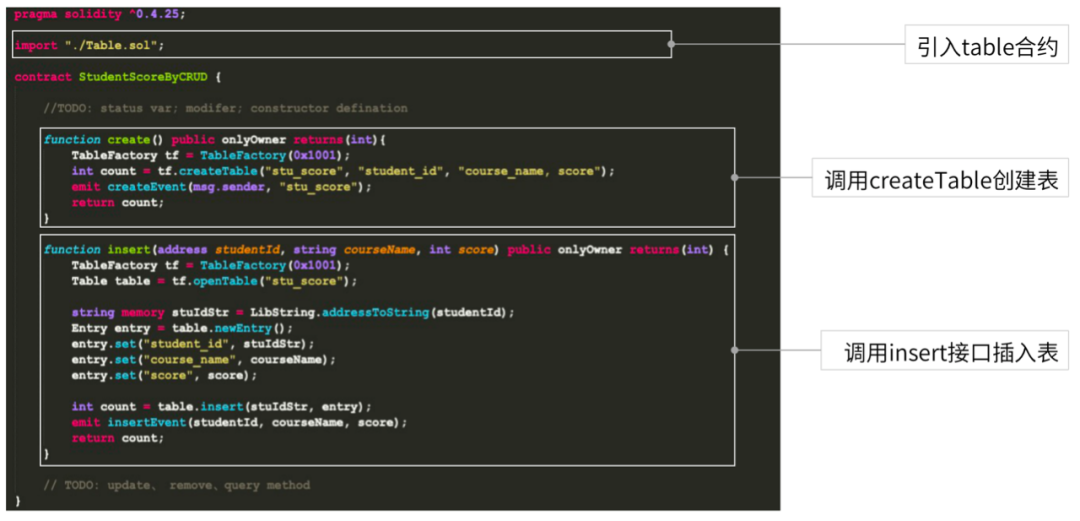 对合约相关状态变量的操作过程中,借助Table合约相关接口操作合约数据。比如,通过Table.insert接入口进行insert操作。