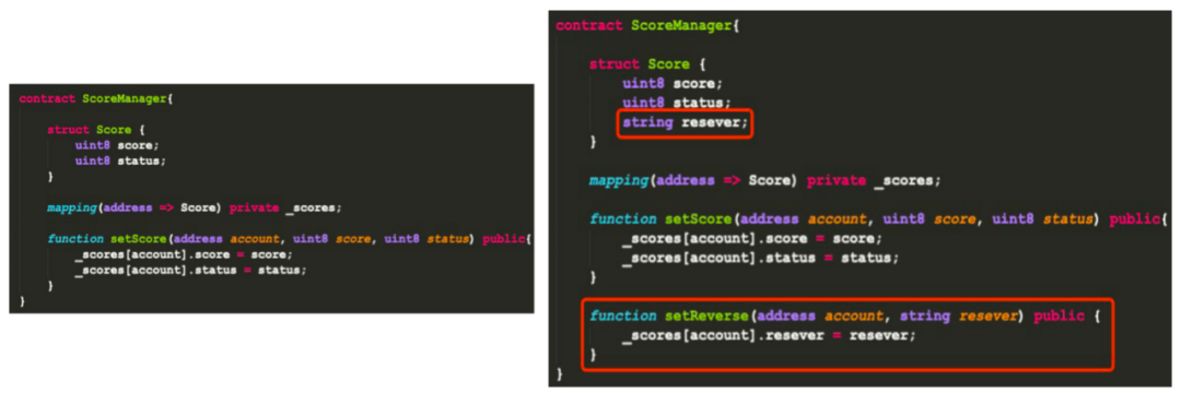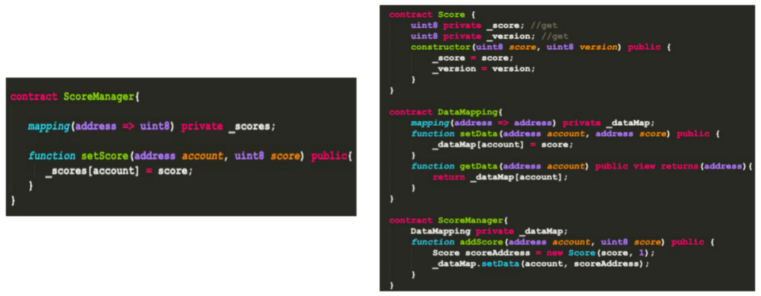 左边的智能合约通过setScore对成绩做管理,但如果要对学生成绩增加其他属性,那整个合约需要重新定义、部署,导致之前链上的数据没法使用。