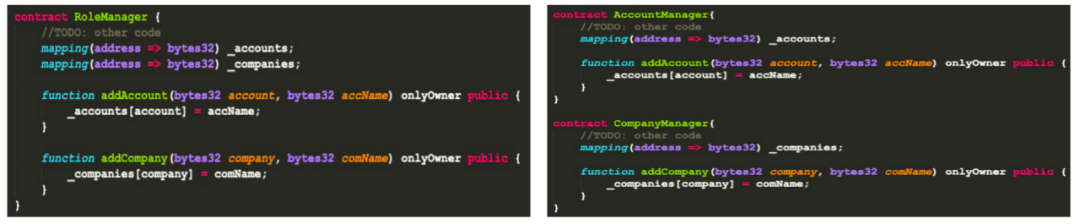 通过右下的方式把不同实体的操作分离。当修改account操作时,company操作不会受影响,从而减少了智能合约的维护成本。