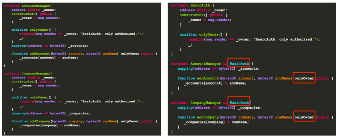 在左边合约里,每个合约都有onlyOwner修饰符,如果10个合约同时使用这个修饰符,维护成本将非常高。因此,建议大家重构出Base合约,在具体业务合约中继承,就可以进行复用了。这就是抽象通用逻辑实现合约的可扩展性。当下次合约升级时,只需修改Base合约即可。