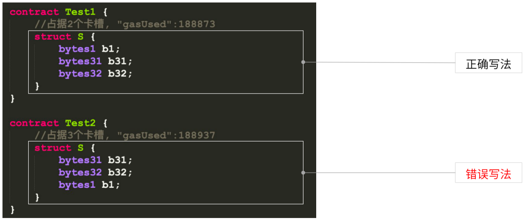 在上面示例中,如果定义了一个bytes1、bytes31、bytes32,同样占据的是64个byte,这里因为bytes1和bytes31在同一位置,EVM自动打入一个卡槽。而错误写法里,EVM放到了两个不同卡槽。因此上面的结构体占据两个卡槽,下面的占据三个卡槽,它们使用资源的情况也不同,在实际操作中,需要注意这些细节。