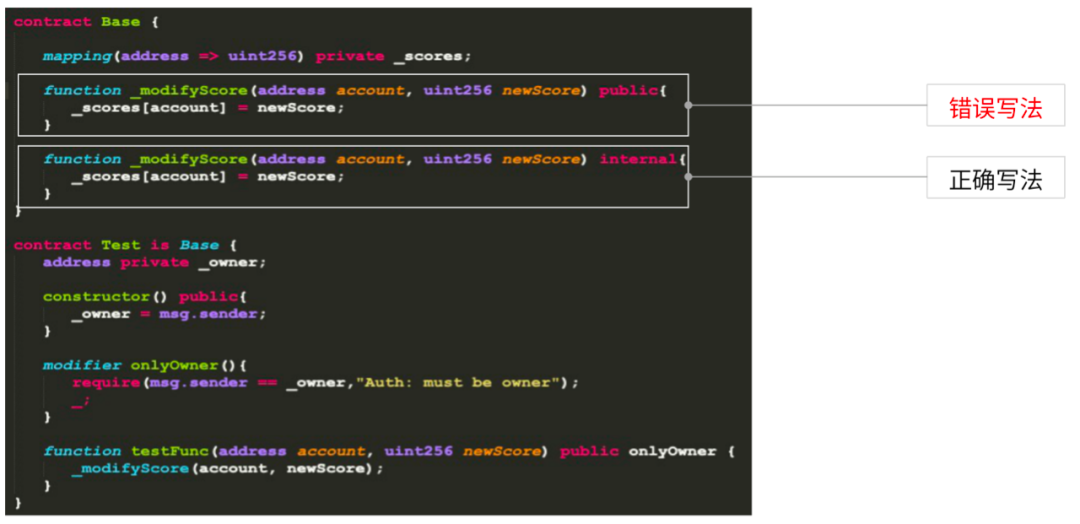 这里有两个modifyScore,一个使用的是public,另一个使用的是internal。两者区别在于,下面的Test合约里继承了Base合约,在testFunction里利用onlyOwner调用modifyScore。