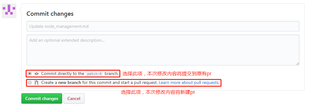 4.下拉至页面结束处,如选择将本次修改内容提交到原有pr(默认第一项),可直接点击`Commit changes`按钮,修改完成;