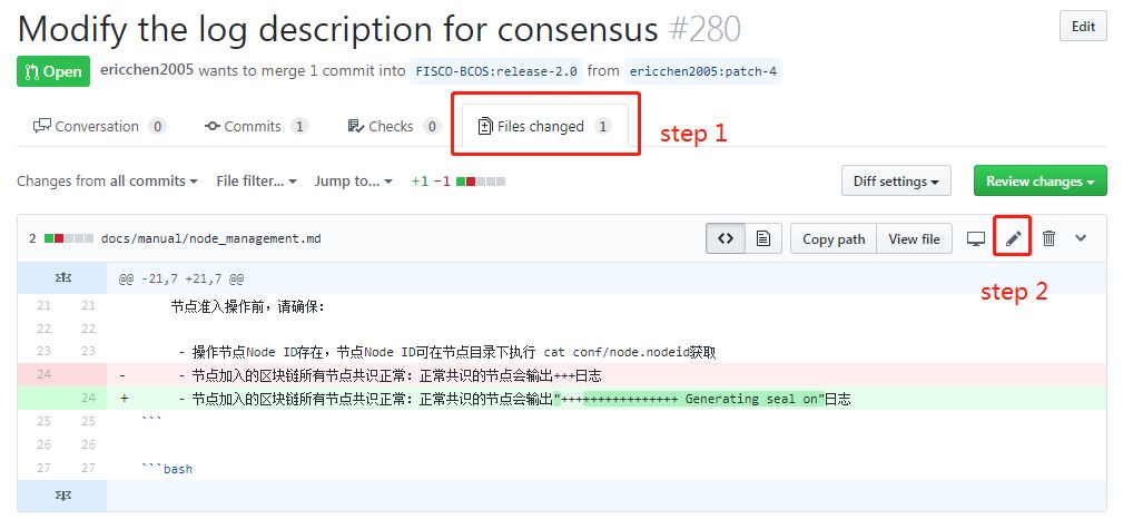 2.点击`Files changed`进行页面跳转,再点击铅笔状图标;