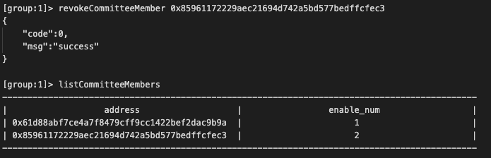 此时系统中有账号1和账号2两个委员,默认投票生效阈值50%,所以需要两个委员都投票撤销账号2的委员权限,有效票/总票数=2/2=1>0.5才满足条件。