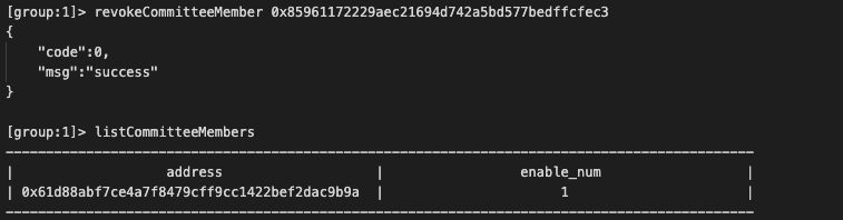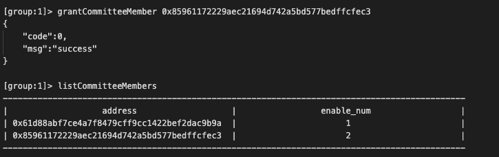 增加委员需要链治理委员会投票,有效票大于阈值才可生效。此处由于只有账号1是委员,所以账号1投票即可生效。