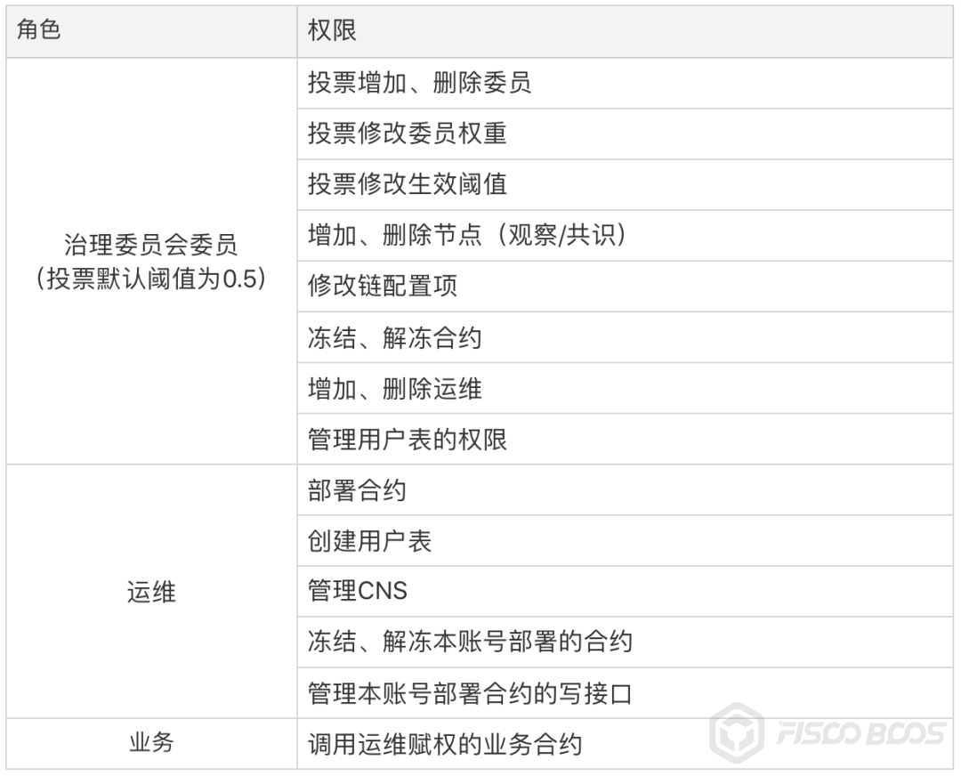 委员可以添加与撤销运维角色,运维角色的权限包括部署合约、创建表、冻结解冻所部署的合约、使用CNS服务等。
