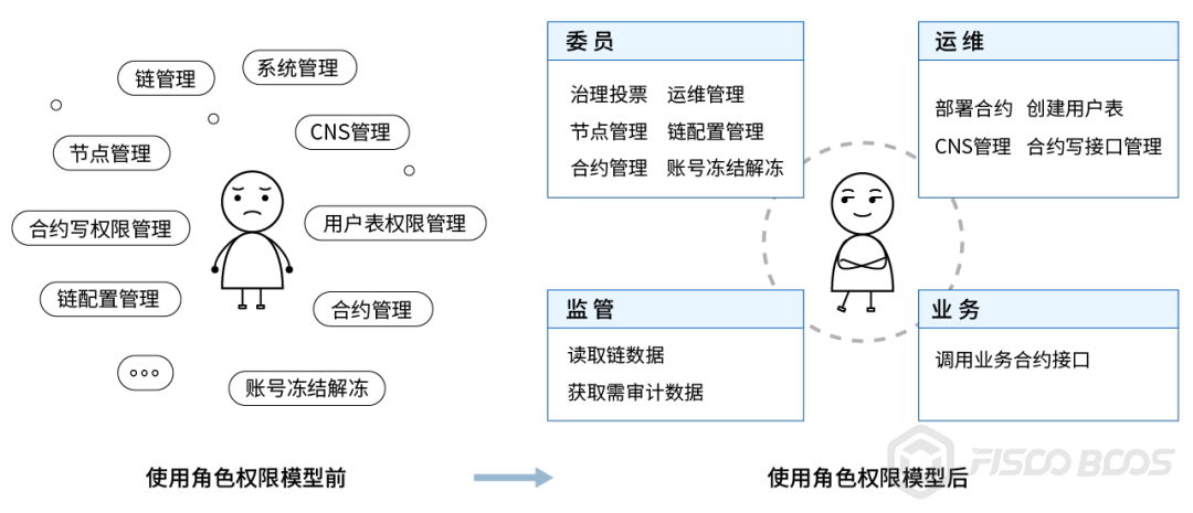 使用角色权限模型后,用户只需记住角色,而角色对应的权限不言自明,例如,治理委员会委员拥有链治理相关权限,这极大降低用户理解难度与学习成本。