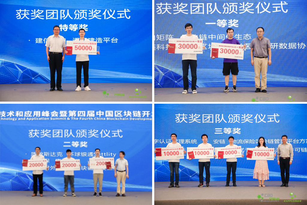 会上发布了第四届区块链开发大赛获奖团队名单,特等奖由建信筑和团队获得。