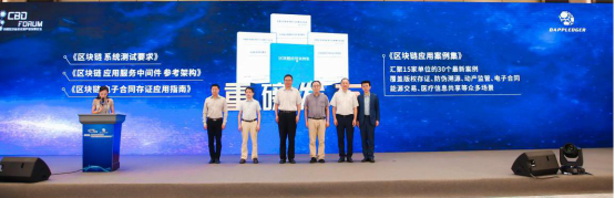 工信部信发司调研员李琰、中国电子技术标准化研究院赵波院长、中国互联网投资基金管理有限公司董事总经理汪存富、人民网创业投资有限公司总经理段欣毅、中国万向控股有限公司副董事长兼执行董事肖风、中金资本联席总裁单俊葆共同发布了区块链标准化成果《区块链应用案例集》和《区块链 系统测试要求》《区块链 应用服务中间件 参考架构》《区块链 电子合同存证应用指南》三项团体标准。