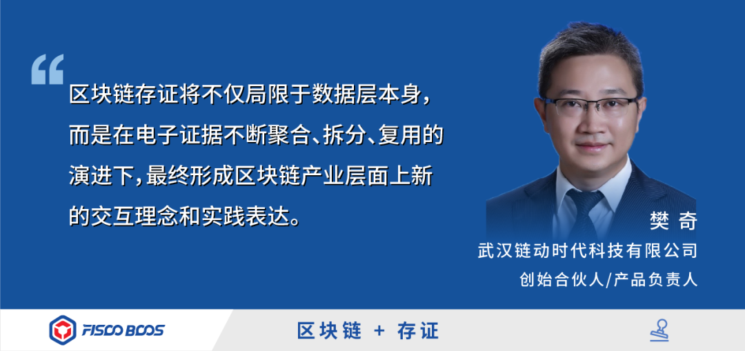 未来的区块链存证业务将不仅仅局限于数据层本身,而是在电子证据不断聚合、拆分、复用的演进下,最终形成区块链产业层面上新的交互理念和实践表达。业务数据、电子合同、版权保护、证件证书、防伪溯源、公益捐赠等场景和领域或将迎来新的产业格局,愿和各位一同拭目以待。