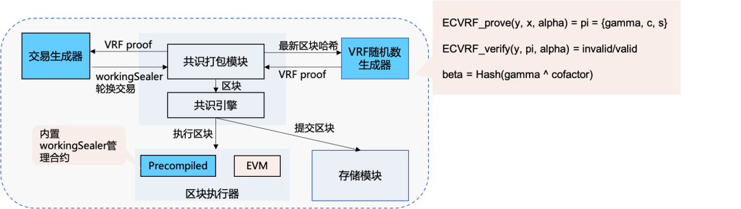 下图是基于VRF的rPBFT共识框架,其核心组件包括VRF随机数生成器、交易生成器以及内置的共识委员管理合约。