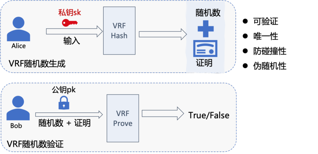 因此,给定输入和私钥,使用VRF算法生成的随机数是唯一的,验证者可通过VRF证明推导出随机数,并使用VRF证明、VRF随机数生成者的公钥验证VRF证明是否有效。