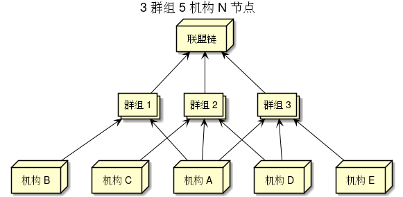 其中机构 A 是仲裁机构,它同时加入到3个群组之中。