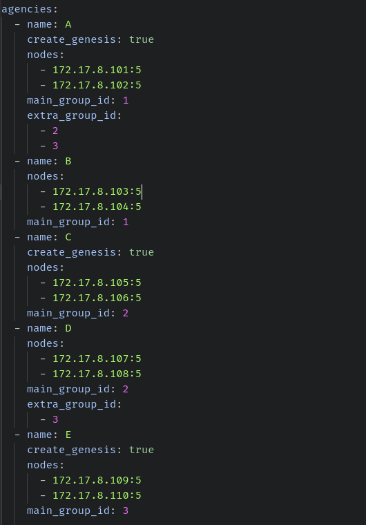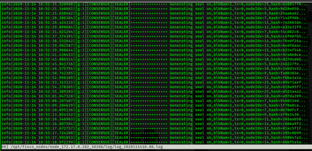 以仲裁机构 A 的节点文件为例,它们同时拥有了3个群组的创世区块。部署到目标服务器启动后,查看日志输出,全部达成共识,正常运行。