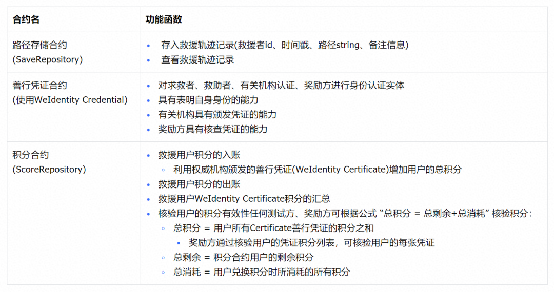 善行凭证合约(使用WeIdentity Credential),权威机构颁发善行凭证,为救援者发放善行积分。