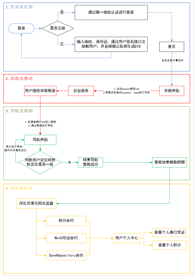 路径存储合约(SaveRepository),通过记录救援者的救援轨迹,既可以避免救援者被讹诈,也可以为有关机构提供救援过程的核验依据。