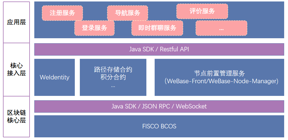 系统以FISCO BCOS为区块链底层,并利用WeBASE、WeIdentity等组件,构建WeHelp的区块链系统后台,相关架构如图所示: