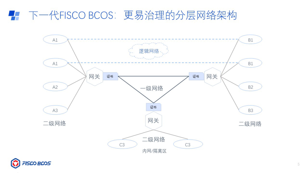 通过这样的分层网络架构,机构内部可以自行决定,或者应该自行决定的事情,将被交还给机构内部,而联盟链上层解决的是联盟链这一层的事情,这样就可以让整个架构、未来治理更安全和可靠。