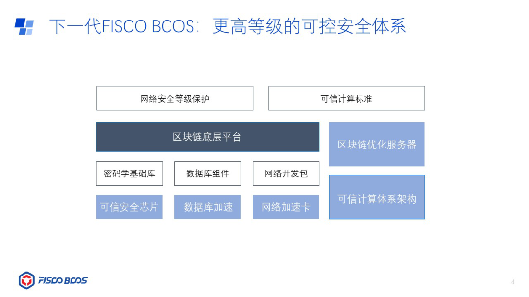 所以,下一代FISCO BCOS将会在硬件和软件层面进行结合,走软硬件协同技术路线,通过引入可信安全的芯片,加上数据库加速、网络加速硬件设备,以及国产可信计算体系架构接入,来打造出软硬件协同一体的区块链解决方案,配合在特定场景下的专用区块链优化服务器,来辅助不同行业,特别是政务、金融等行业的特殊需求。