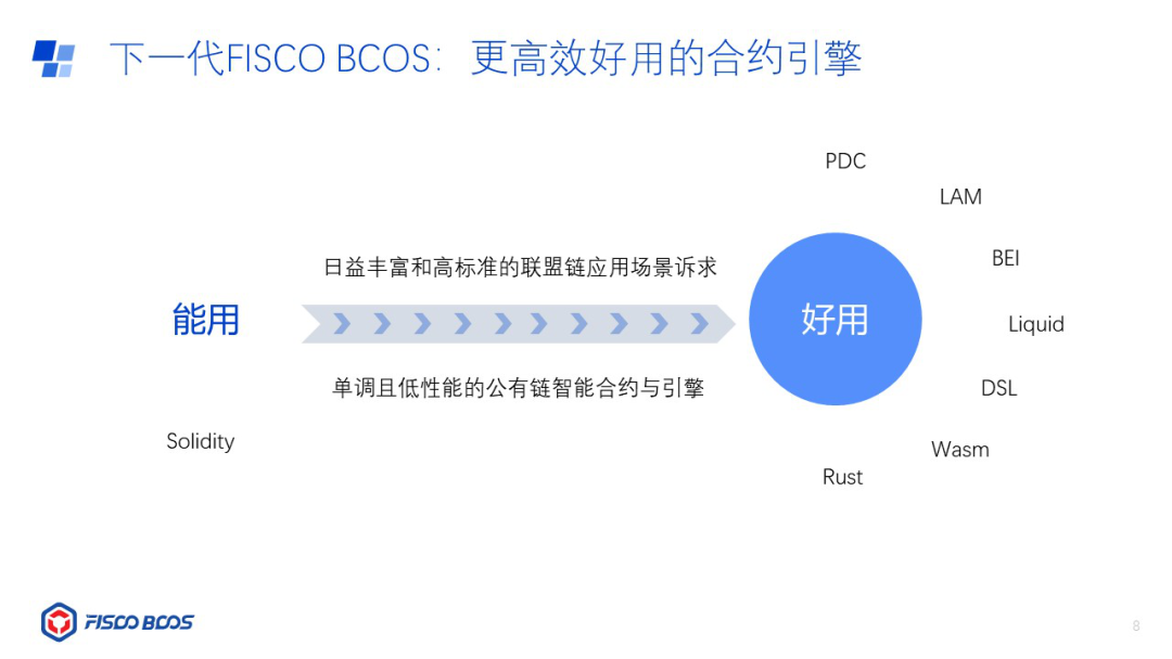 通过这样的方式,FISCO BCOS将打造出新的智能合约以及智能合约引擎。通过打造更高效的合约引擎,合约将从以前能用的阶段,转化到未来更好用的阶段。