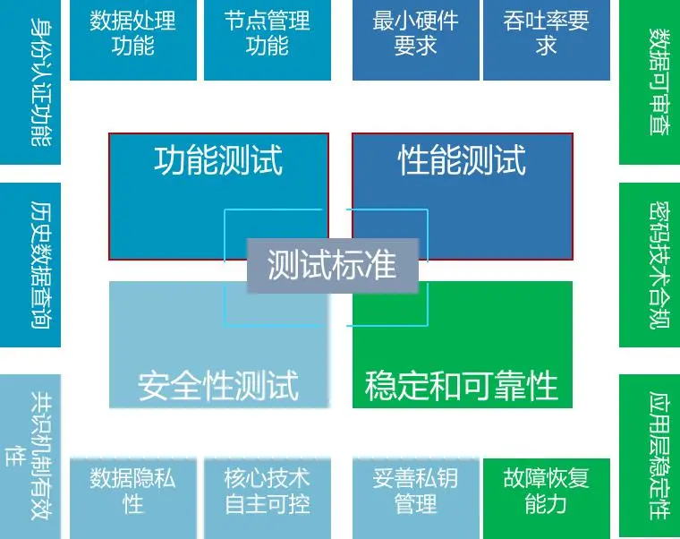 性能测试:《区块链 系统测试要求》;《GB/T 25000.51-2016《系统与软件工程 系统与软件质量要求和评价(SQuaRE) 第51部分:就绪可用软件产品(RUSP)的质量要求和测试细则》。